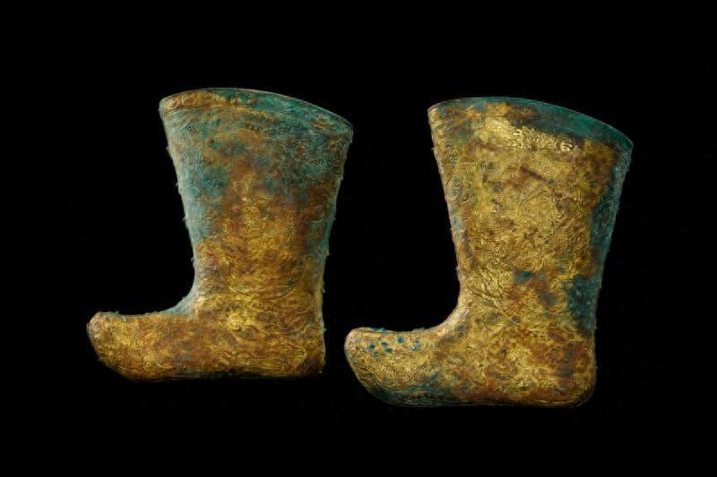 这双靴子应是专为丧葬制作,式样与丝绸所制的实物相似,装饰却更为繁琐,饰以飞凤、花卉和卷云纹。鞋履在已发掘的辽代遗存中鲜见,陈国公主与驸马合葬墓中出土过一双凤纹金花银靴,出土时穿于公主银丝足网之外。